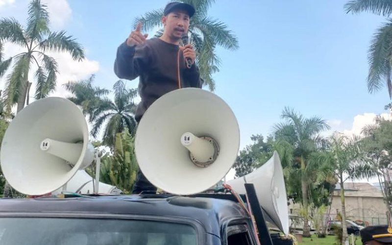 Ketgam : Ketua gerakan pemuda marhaenis (GPM) kabupaten konawe utara, Anto Madusila saat orasi di pelataran kantor bupati dan Kantor DPR Kabupaten Konawe Utara
