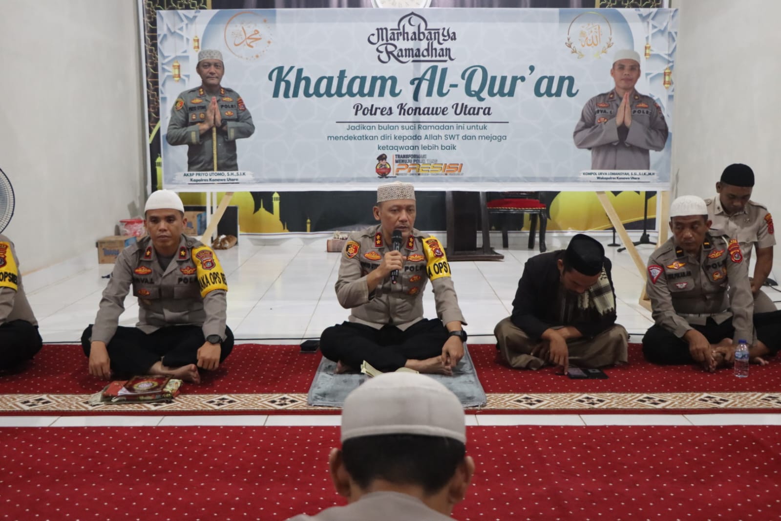 Acara Khatam Al-qur’an dipimpin Kapolres Konut AKBP Priyo Utomo, S.H., S.I.K diikuti para pejabat utama (PJU), para Kapolsek, Perwira serta personel Polres Konawe utara yang disaksikan Ustad Marwan, S.Pdi, para Santri Pesantren Hidayatullah dan anggota