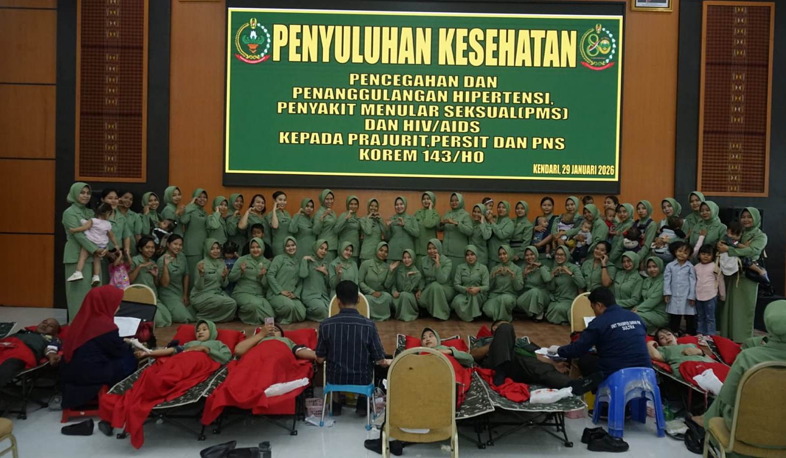 Setelah penyuluhan, kegiatan dilanjutkan dengan donor darah sebagai bentuk kepedulian sosial keluarga besar Korem 143/HO. Seluruh rangkaian kegiatan berakhir pada pukul 14.00 Wita dan berjalan aman, tertib, serta lancar.